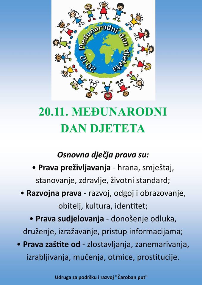 Međunarodni dan djeteta, 20.11., obilježava se s ciljem boljeg razumijevanja, prihvaćanja i dobrobiti sve djece. Generalna skupština UN-a je 20. studenoga 1959. godine usvojila “Deklaraciju o pravima djeteta”, a 1989. godine “Konvenciju o pravima djeteta”. Od 20. studenoga 1989. godine u cijelome se svijetu obilježava ovaj dan, koji je potaknula Organizacija Ujedinjenih naroda i njezine specijalizirane ustanove. Obilježavanjem Međunarodnog dana djeteta nastoji se podsjetiti vladajuće političke elite, institucije i civilno društvo na nužnost poduzimanja konkretnih koraka u zaštiti i unapređenju dječjih prava.