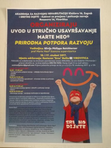 Uvod u Marte Meo® by Silvija Philipps Reichherzer u Virovitici u organizaciji Kabaineta Sretno dijete i Akademije za razvojnu rehabilitaciju. Odlicna i jako zanimljiva edukacija. Doma smo ponesli “dobro lice”, puno novih informacija i ideja za daljnji rad. Veselimo se iducem petku i drugom djelu Marte Meo® edukacije.